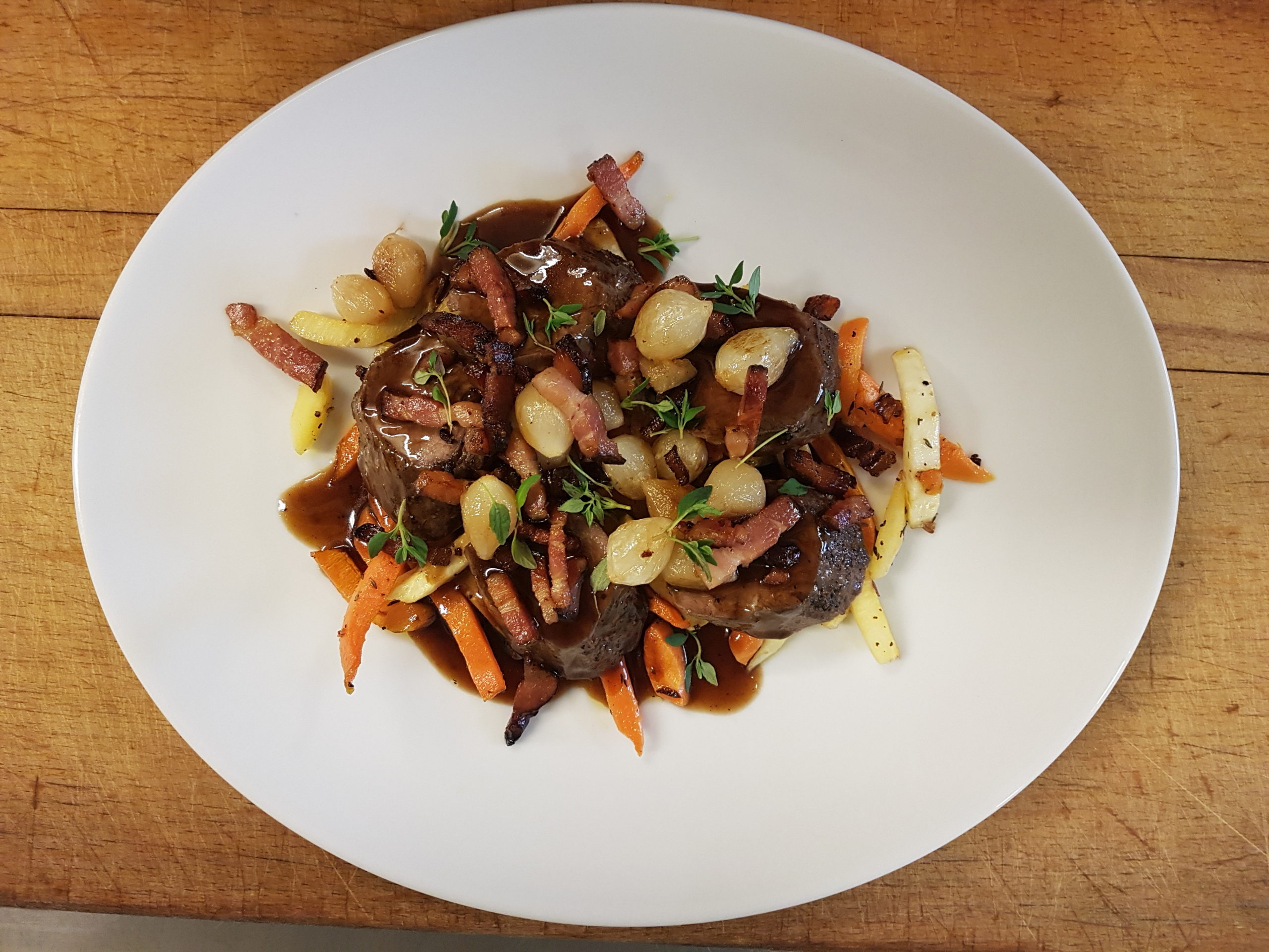 Hjortfärsbiff* med rostade grönsaker – potatis och kantarellsås 180:-
